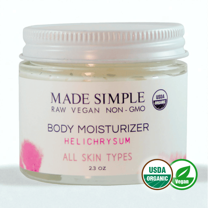 Our USDA certified organic, vegan, cruelty-free Helichrysum moisturizer is designed and whipped to replenish and hydrate your skin while improving its texture and appearance with only 100% all-natural antibacterial plant-based sustainably sourced ingredients. This much-loved moisturizer is based in Shea Butter, Coconut Oil, Almond Oil, and Jojoba Oil. Shea Butter and Coconut Oil are known to reduce stretch marks and promote collagen production. Almond Oil soothes skin irritations like eczema and Jojoba Oil reduces dryness and flakiness.