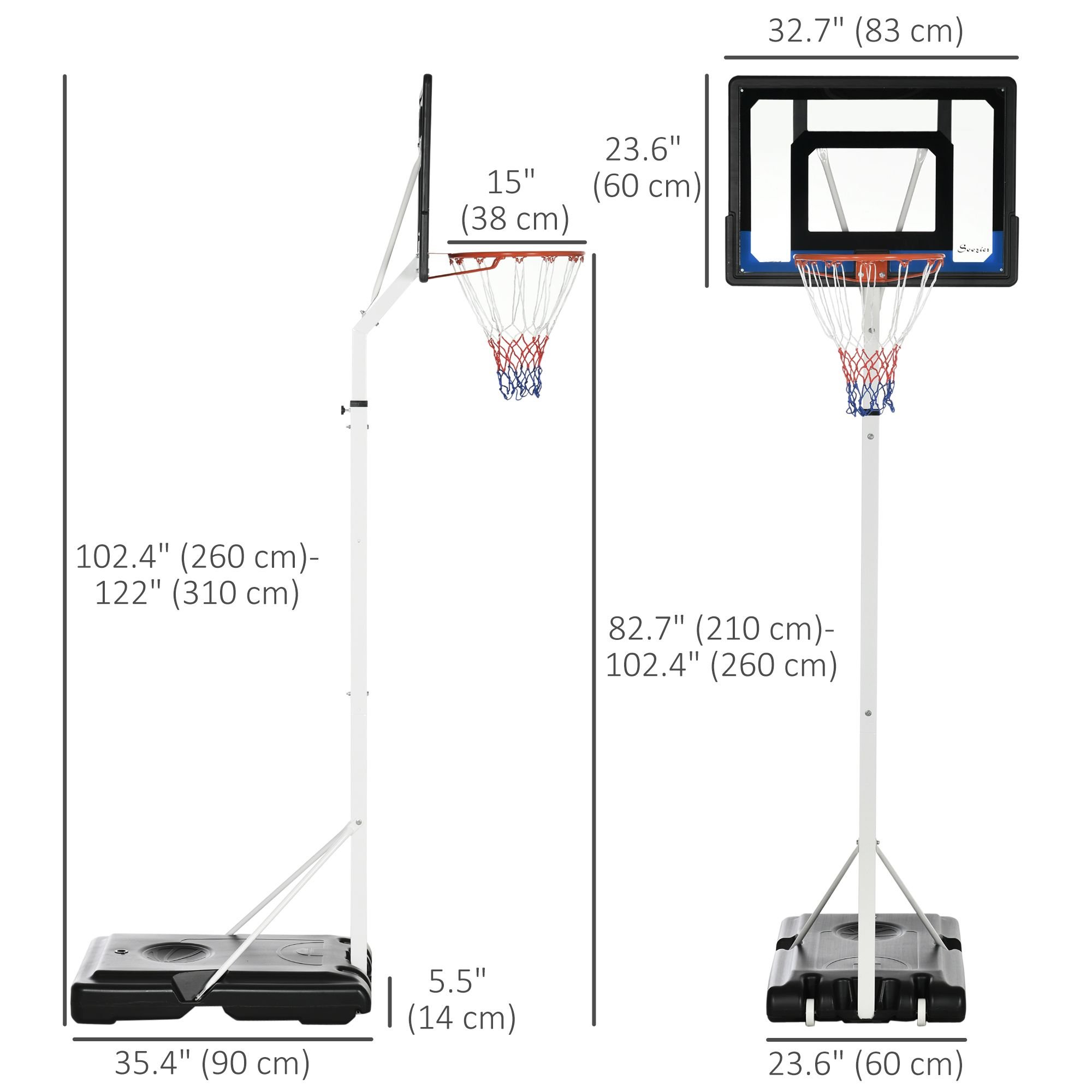 • Backboard dimension: 32.7" L x 23.6" W x 0.8" H (83 x 60 x 2 cm), Overall Height: 102.4"-122" (260-310 cm), Base Dimension: 35.4" L x 23.6" W x 5.5" H (90 x 60 x 14 cm). Assembly required.