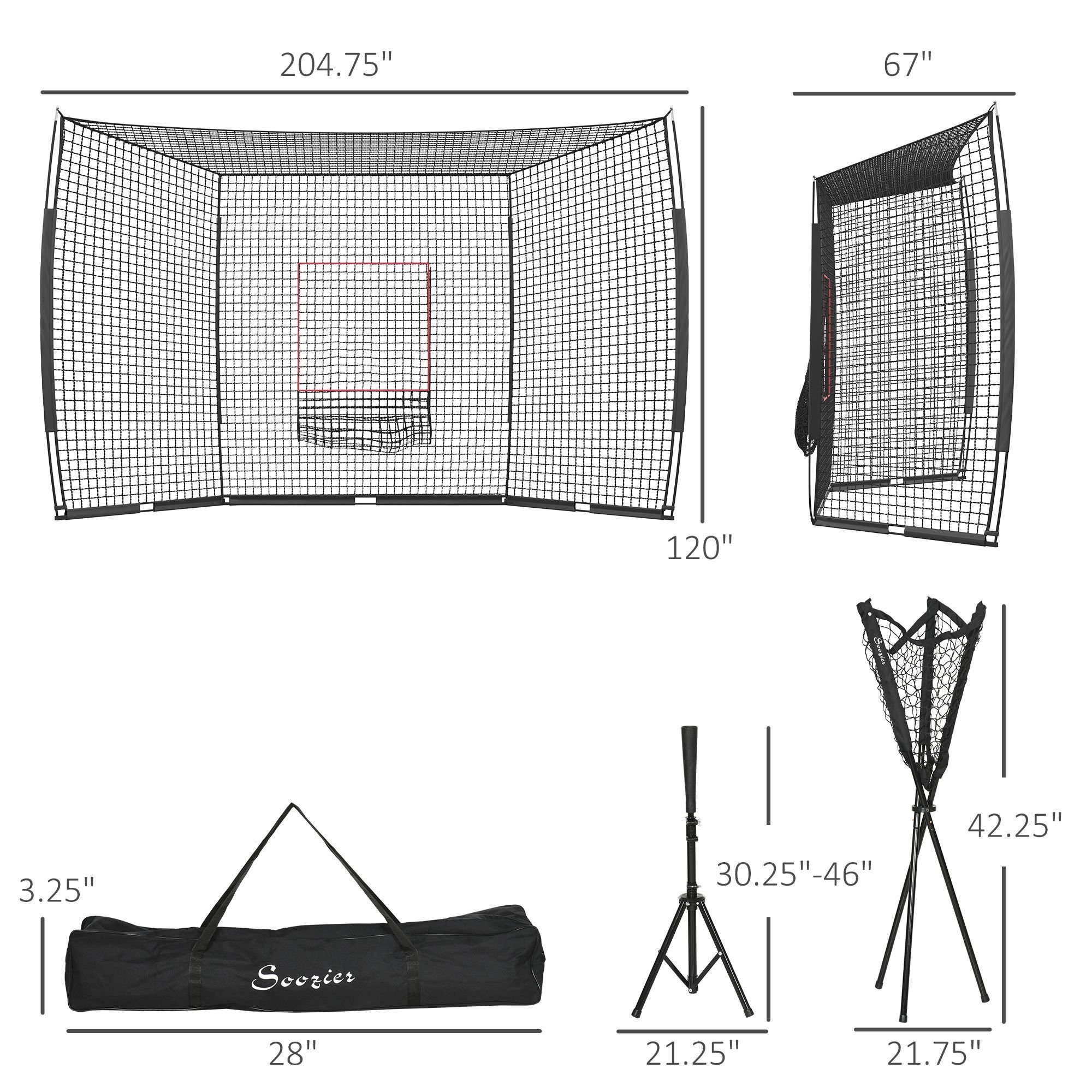 5.- Baseball Practice Net Set Info: Net Dimensions: 204.75"" W x 67"" D x 120"" H. Caddy Dimensions: 21.75"" W x 21.75"" D x 42.25"" H. Tee Dimensions: 21.25"" W x 21.25"" D x 30.25"" - 46"" H.