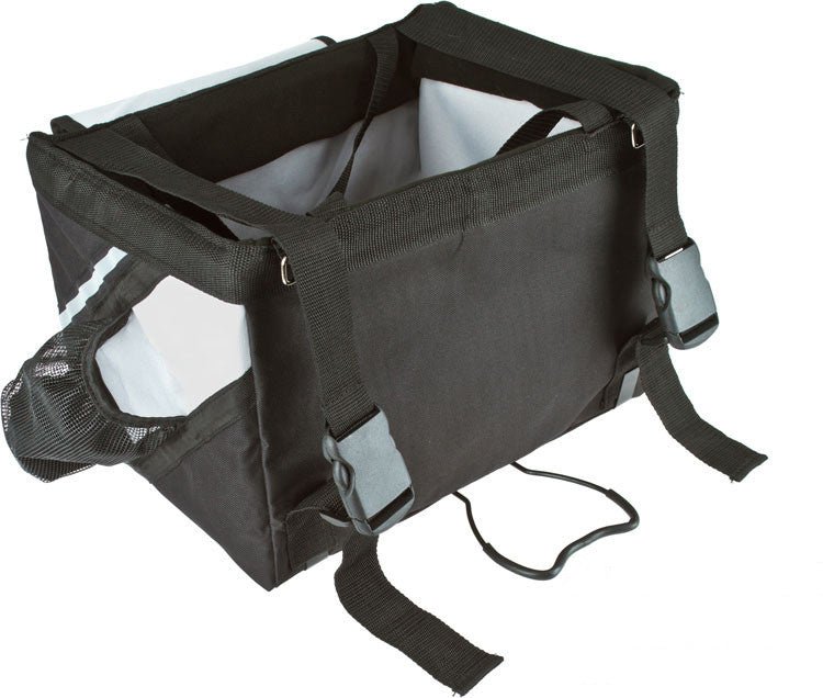 The Pet Life Fur cycle collapsible Dog Bike Carrier easily straps on and connects to the font of the bicycle handle bars by both Nylon and Velcro straps. Features an inner safety leash that connects to any harness or collar for added safety when riding with a durable bottom to support proper weight. Composed of Durable Oxford Nylon with a surrounded lightweight steel metal frame for added support. The Fur cycle also features a frontal Velcro pouch and mesh sided pockets for any added belongings and an zippered entrance at the zip for added visibility. Meant for smaller pets or puppies.