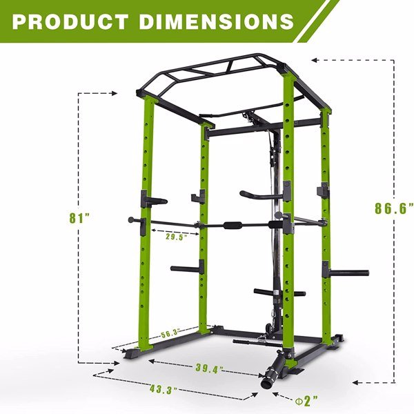 [Steel Frame Structure]The sizes of the assembled power cage are 56.3 in(L) x 43.3 in(W) x 86.6 in(H). Users can rest assured to use it because of its maximum bearing weight: 50x50mm square steel 1000 lbs, pull-up bars 300 lbs, J-hook 500 lbs, safety bar 800 lbs. All premium steels are painted and pickled, which makes them not easy to rust. The inner space of the power cage is big enough for you to exercise fully without hindrance.